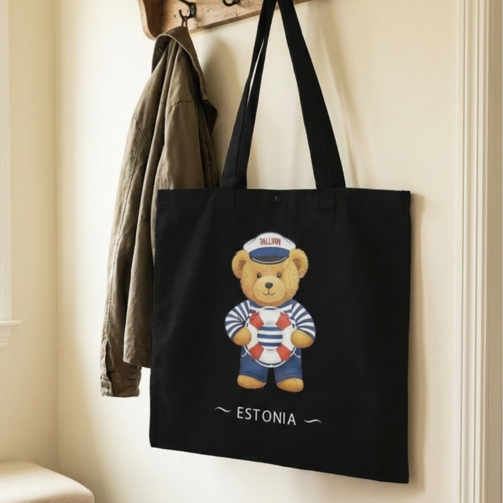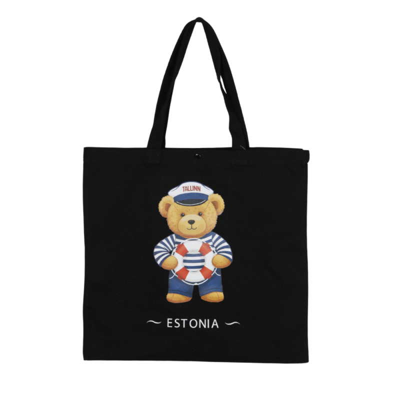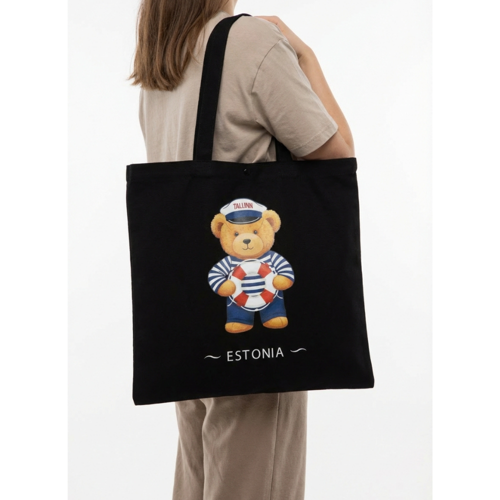 Tallinna merekaruga musta värvi riidest kandekotti. Armsa mõmmikuga kott mahutab kõik olulise, mida päeva jooksul võib tarvis minna. Kott on kerge, kuid praktiline ja sobib ideaalselt poodi, randa või igapäevasteks toimetusteks. Tore suveniir Eestist või lihtsalt armas kaaslane igaks päevaks. Tee lõbus kingitus endale või sõbrale!